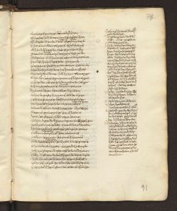 Nel f. 91r sono trascritti i versi 63-95 del i Inno di Callimaco (Inno a Zeus), accompagnati da dieci scolî collocati sul margine destro e alcune glosse interlineari. In adesione alle caratteristiche delle altre pagine del codice, gli scolî non sono scritti in prossimità della parola o dell’espressione di riferimento, ma iniziano dalla prima linea del testo poetico, andando sempre a capo, ad eccezione di un solo caso. Ogni lettera capitale è di colore rosso.