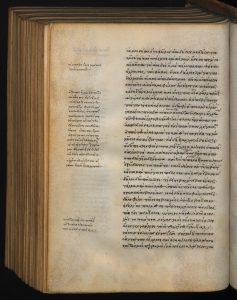 F. 217v preserves lines 5-34 of Callimachus’ Fourth Hymn (Hymn to Delos), with four scholia placed in the right margin and five interlinear glosses. The folio is an example of the scant exegetical apparatus to Callimachus’ Hymns.