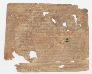 The reverse side of the double miniature contains twenty-five verses of the Iliad: 1.345–1.369. Reading these verses is difficult due to traces of the reagent used by Mai to detach the parchment from the paper, as well as other forms of material damage. Nevertheless, the calligraphic imprint of the writing can be discerned, characterised by a greater contrast between thick and thin strokes than in the 2nd-century AD model of the round capital letter, which had been obsolete for centuries. More generally, the writing is characterised by decorative stylistic elements that date to no earlier than the late 5th century (Cavallo 1973) and recalls two Homeric and Platonic papyrus fragments (P. Duke inv. G.5; P.Ant. II 78). The scholar attributes these fragments to the same copying centre in Alexandria as the Ilias Picta, on account of their exceptional nature. Here, the choice of a strongly archaic script would have been motivated by a desire to preserve ancient and pagan culture in the face of rampant Christianity.