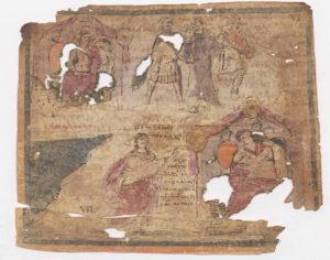 In miniature VI, Achilles sits in his tent, surrounded by other characters as in miniature V; to his right, Briseis turns to look at him as the two heralds drag her away, holding her by the elbow and wrist, respectively. In miniature VII, the tent of Achilles and his companions can be seen on the right. The hero rests his head on his right hand, leaning his elbow on his knee in a contrite manner. On the left is his mother, Thetis, reaching out towards the tent with her right hand and two raised fingers. The sea is towards the left margin, from which Thetis emerged to go to her son, according to the poem (1.348 ff.). The entire sheet is in poor condition, being both damaged and patched. Bianchi Bandinelli has identified pictorial additions to image VII dating from the 11th century.