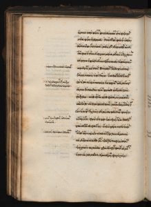 Folio 108v transmits verses 147-165 of Callimachus’ Third Hymn (Hymn to Artemis) and constitutes a representative example of the scant exegetical apparatus accompanying this collection of Hymns. The page is mainly occupied by the verses, accompanied by four short scholia placed along the left margin and by two interlinear glosses written in red ink, following the practice regularly adopted by the scribe.